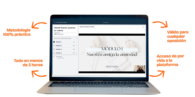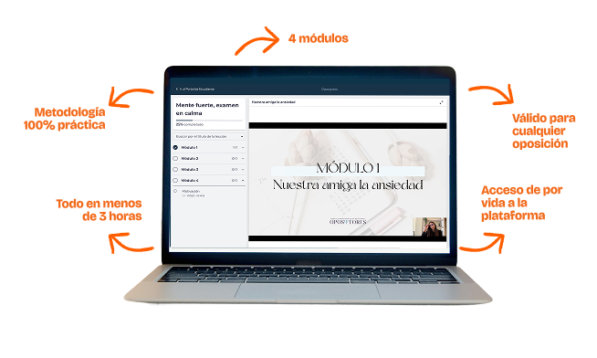 El contenido completo dura algo más de 2 horas y media y está estructurado de forma clara para que puedas comprender las técnicas y empezar a utilizarlas en tus repasos y simulacros desde el primer momento.